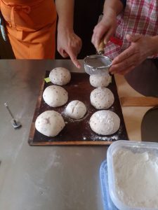 ある程度台の上で丸めて、手の平上で片手の小指側をパン生地の下に