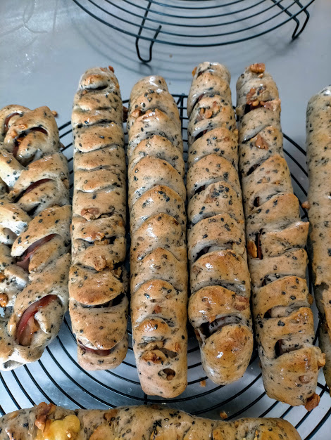 生地に黒ゴマ・にんにく・クルミ・胡椒が混ぜ込まれております。
